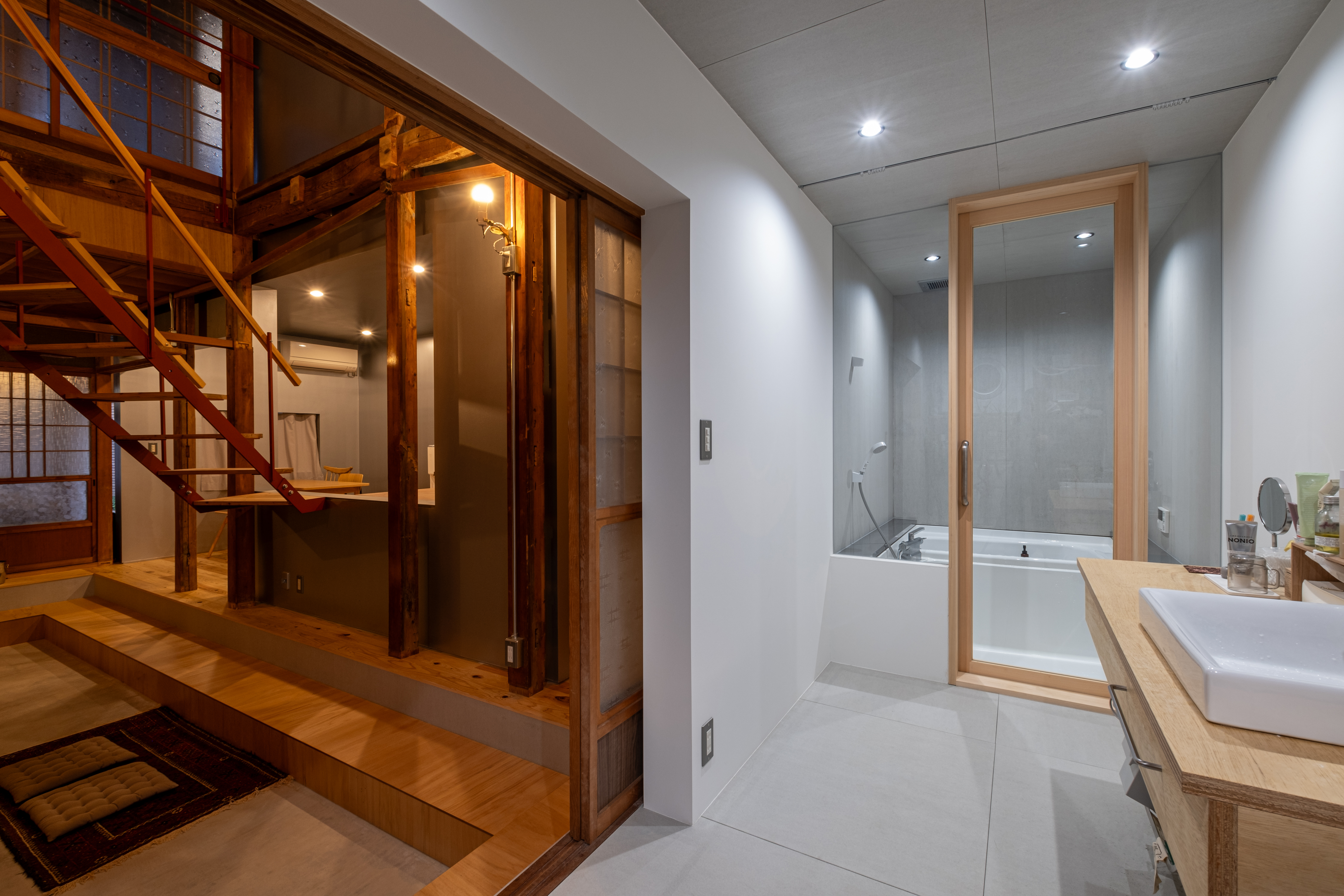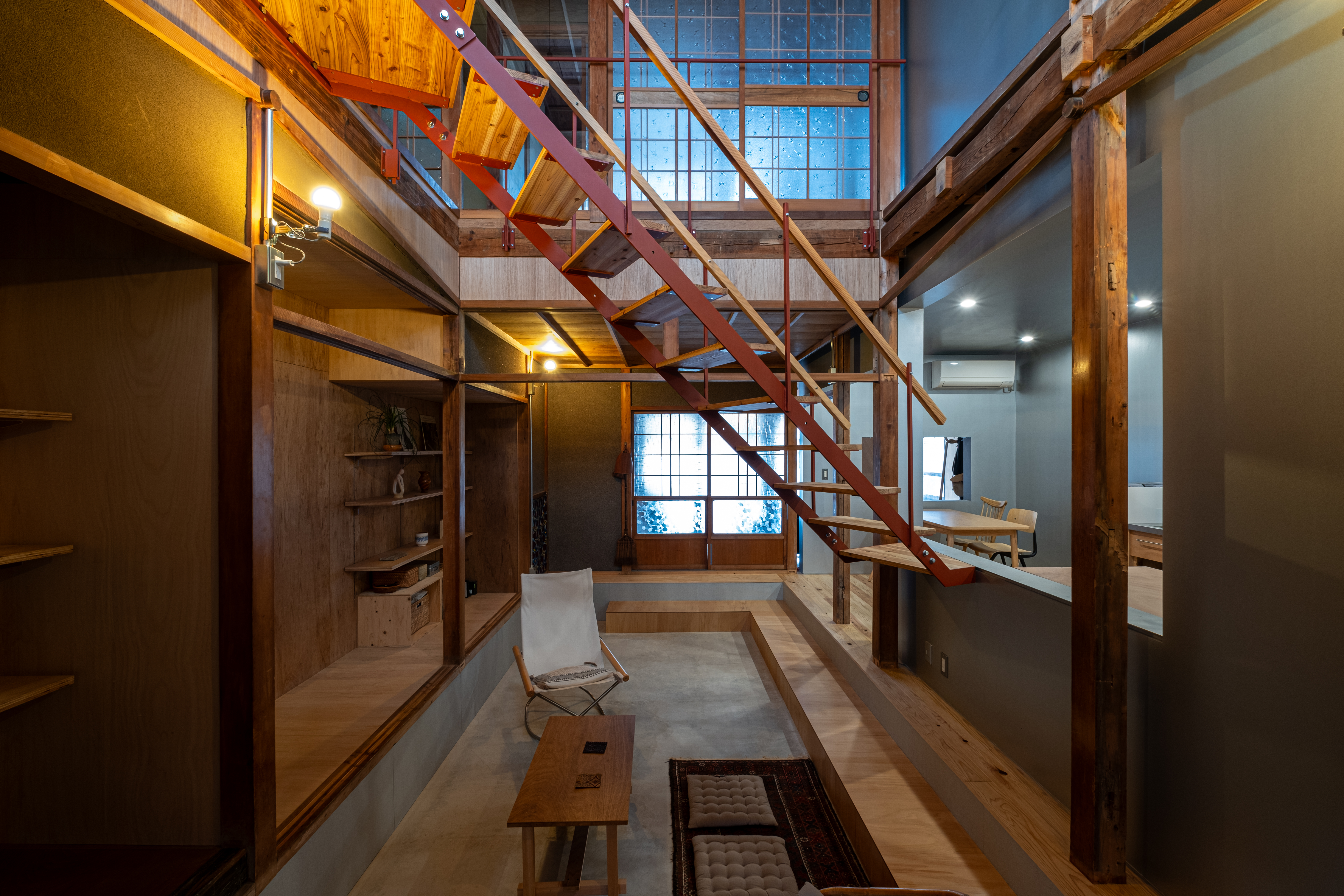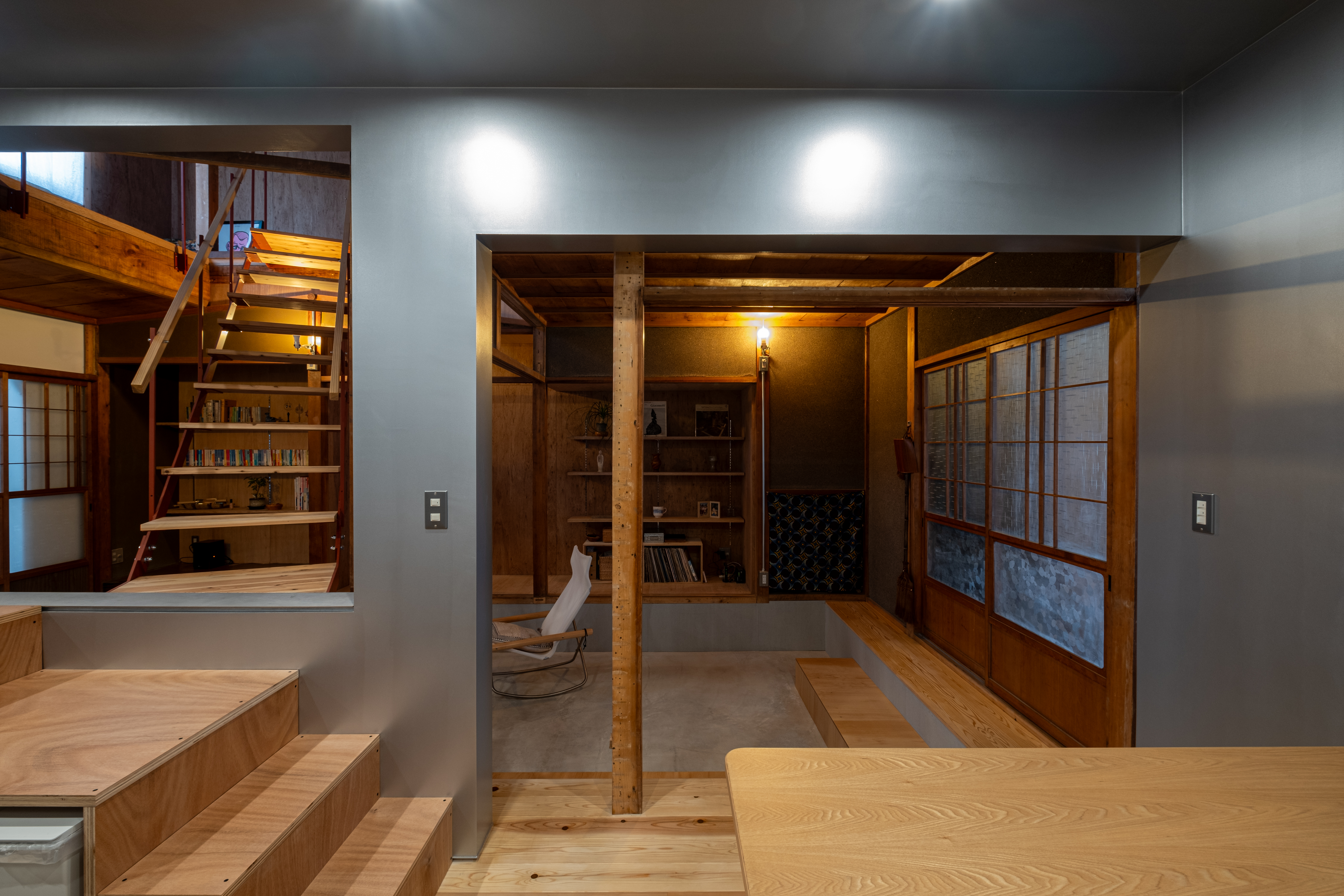 木造の軸組みの中に、一階をキッチン・ダイニング、二階を寝室の要素をもつ断面的に空間を横断するボックス。洗面・浴室の要素を持ったボックスの2種類の空間を挿入。ボックス部分は、構造的補強、断熱などの機能的な役割を担っている。また既存空間と新設のボックスの間に隙間を設けることで、回遊できる廊下や収納部分として機能するように配置を行なった。ボックスの一階部分の開口からニ階へ繋がる階段を設け、新旧の空間を立体的に繋げるような構成となっている。ボックス状の空間は吹き抜け部分に面しているため、開口部からの彩光を反射し、空間全体に光がまわるようにシルバー塗装の仕上げとした。